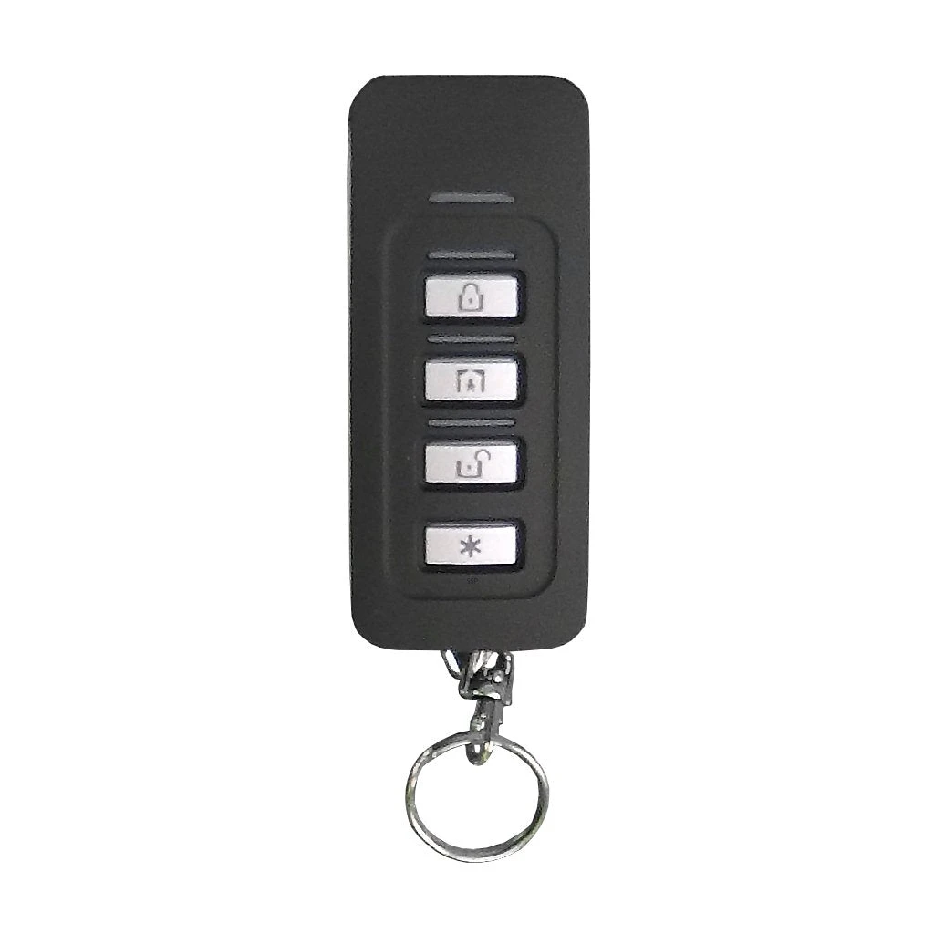 This keychain remote features 4 summarys for arming in stay and away modes, disarming the system, and a functional panic key which you can use to set off an audible siren to warn would-be attackers or a silent alarm to bring the police. The panic key has a delay press feature that will prevent false alarms.
