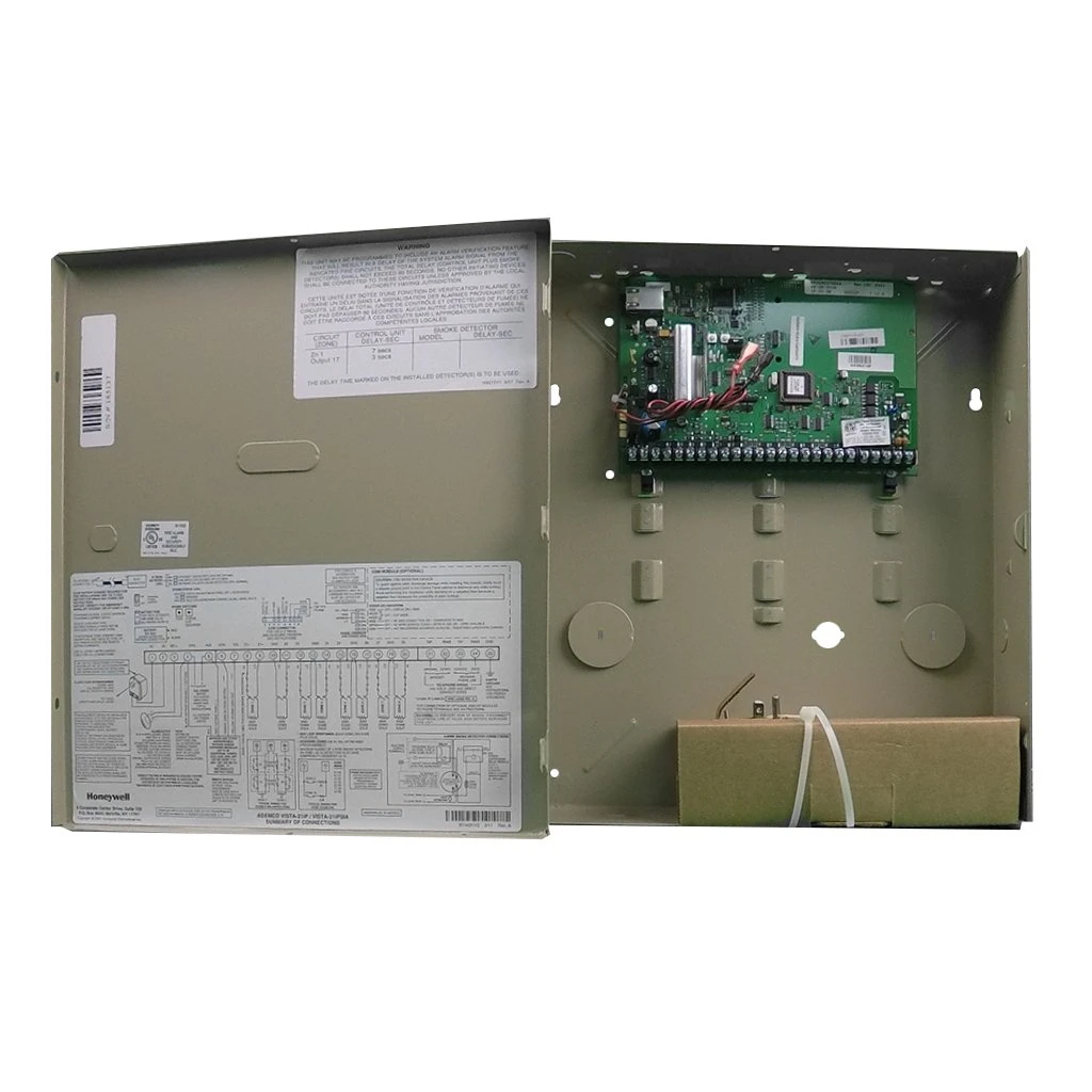 The Ademco Honeywell Vista 21iplte is a upper level system that can do eight hardwire zones out of the box, with the capability to do up to 48 zones total (wired or wireless) with the use of hardwire expansion and wireless expansion modules. Has two built in low current trigger outputs with expansion capability of up to 16 total. Features two system partitions, plus a common partition area, supports two wire (up to 16) and four wire type smokes, features up to 48 user codes, and a time stamped 100 event log viewable on the 6160 series model keypads.