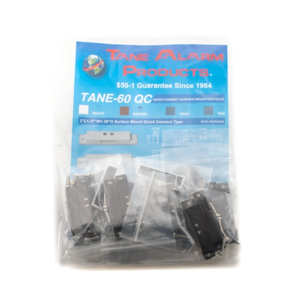 The TANE 60QCBR Mini Surface Mount Brown Contact is the perfect fit if you don’t want to drill into your doors or windows to install. These can be used to protect any opening such as doors, windows, etc. You’ll get a set with every contact. One side is the reed switch that opens the circuit when the other side, the magnet, is separated from it. This in turn will cause an alarm event if your system is armed.